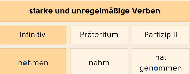 Сильні (неправильні) змінюють кореневу голосну й закінчення: sehen → gesehen, essen → gegessen. Їх потрібно вчити напам’ять.